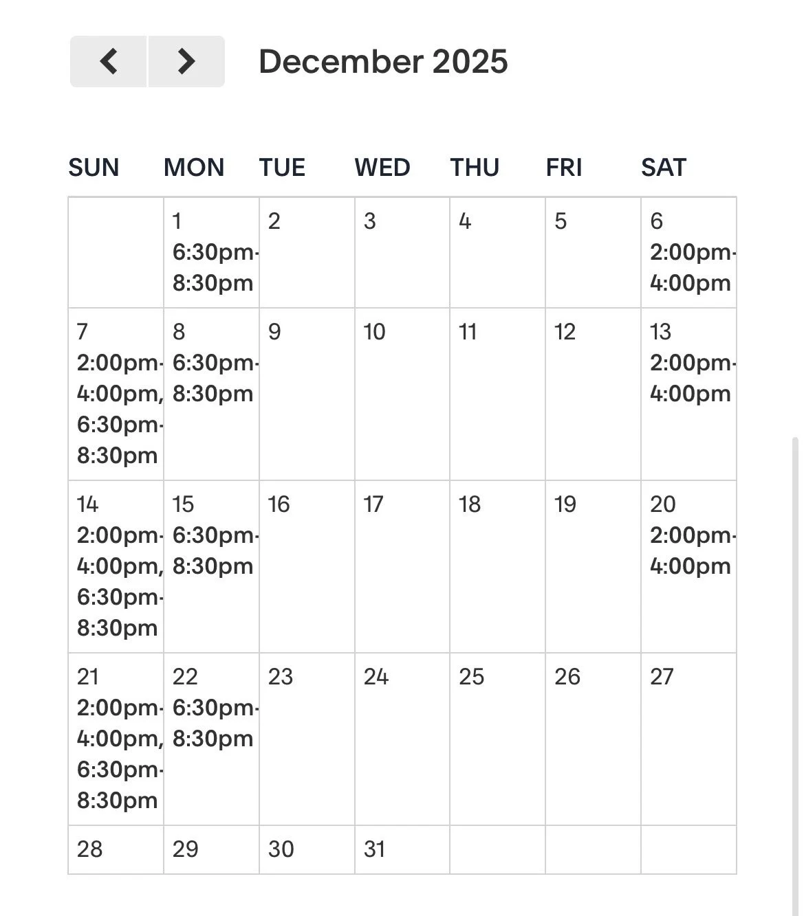Private events: I’m flattered and honored you are interested in celebrating here! Currently all of my energy goes toward hosting regular sessions. My hope is that you can find an available time that works for you and your friends and come into an already well-running situation.